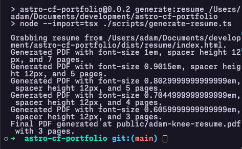- Generates my resume PDF from HTML using NodeJS and Playwright during the build.